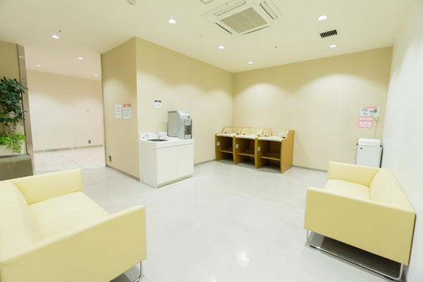 広々としたお部屋にソファ・調乳ができるお湯・流し台・おむつ交換ベッド・専用ダストボックスがあります。