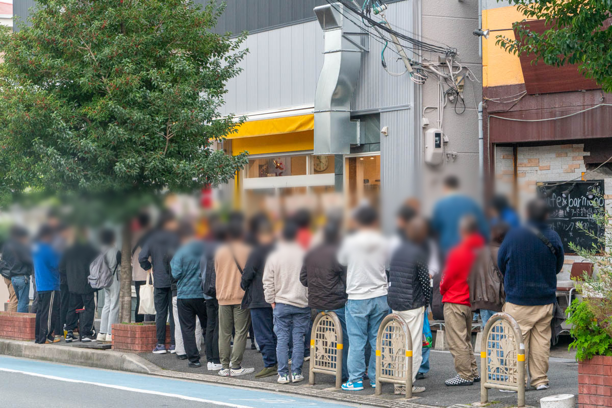 堤町の「TARYUTO」店舗前から枚方公園駅に通ずる道まで伸びる行列。タルトの半額セールなどが行われていました。