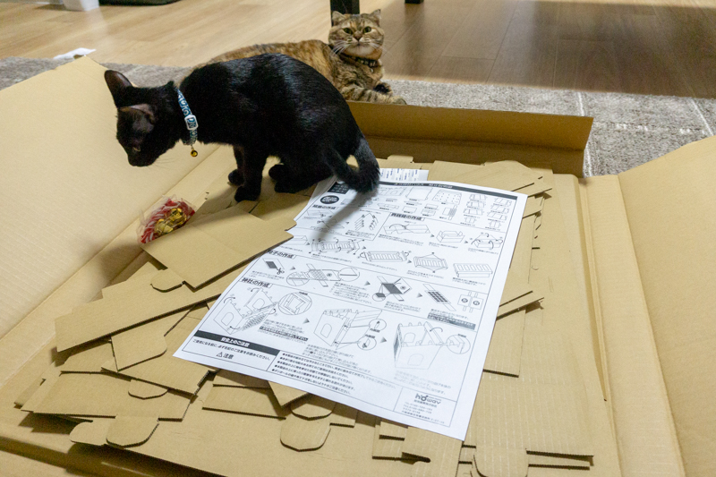 ダンボールを基本はめこんで組み立てていくので(付属の両面テープで一部貼り付けます)、猫も安心して遊べそう!わが家の猫二匹がバタバタ暴れて使ってますが、耐久性もいい感じです。