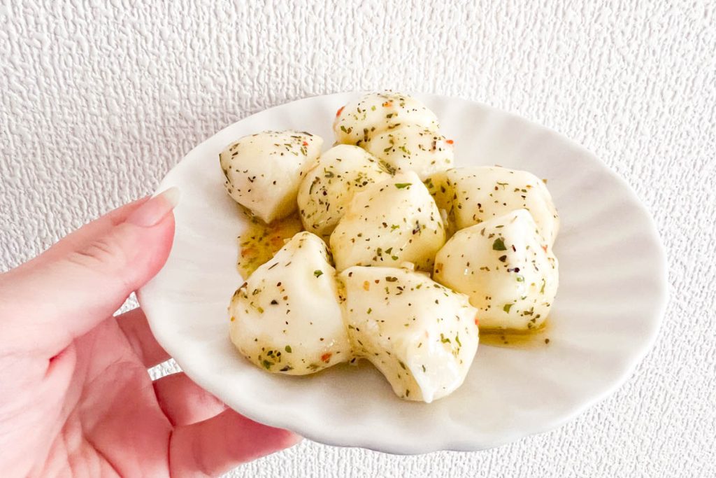 袋から出すとこんな感じ。普段からよくモッツアレラチーズ買って家でカプレーゼにするんですが、これだったら味付けいらずですぐおいしく食べられちゃいます。けっこう味が濃い目なのでトマトとか切って和えても良き!