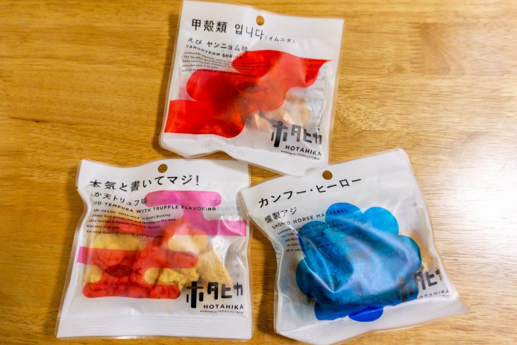 「ホタヒカ(→公式サイト)」は珍味ギフトブランド『Hotaru no Hikari』監修のおつまみなんだそうで、このほかにもたくさんの種類が売ってたんですが、どれもおいしそうで売り場でめっちゃ迷いました。