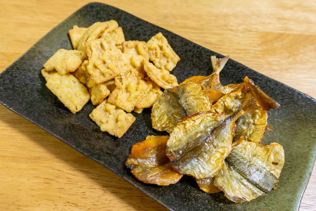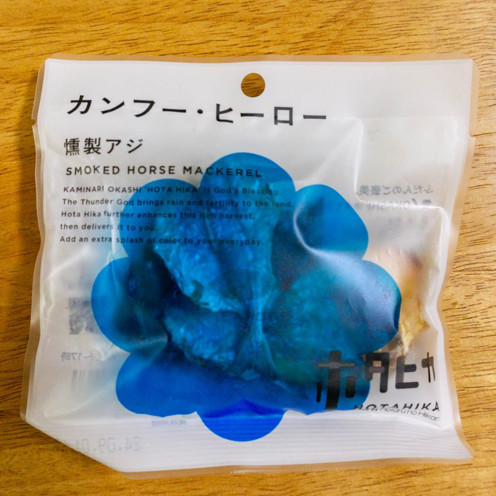 アジの燻製は袋を開けただけで燻製の香りがすごい!身の部分は硬すぎず半生っぽい食感でクセになる味付け、尻尾や小骨はパリパリ食感でウマい。