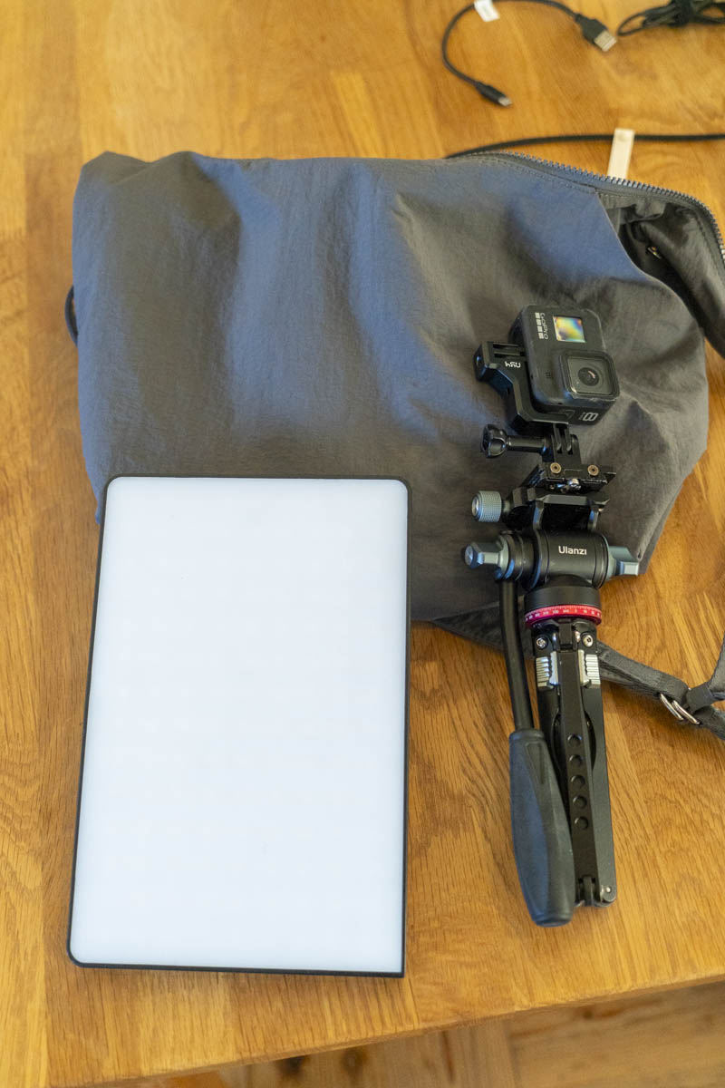 それを突破してくれたのがGUのカバン。2000円ちょうどくらい。ユニクロからGUに乗り換えた結果、上記写真のA4くらいあるライトや、ミニ三脚&雲台&GOPROセットがするっと入るようになって、バイク移動がより捗るように!