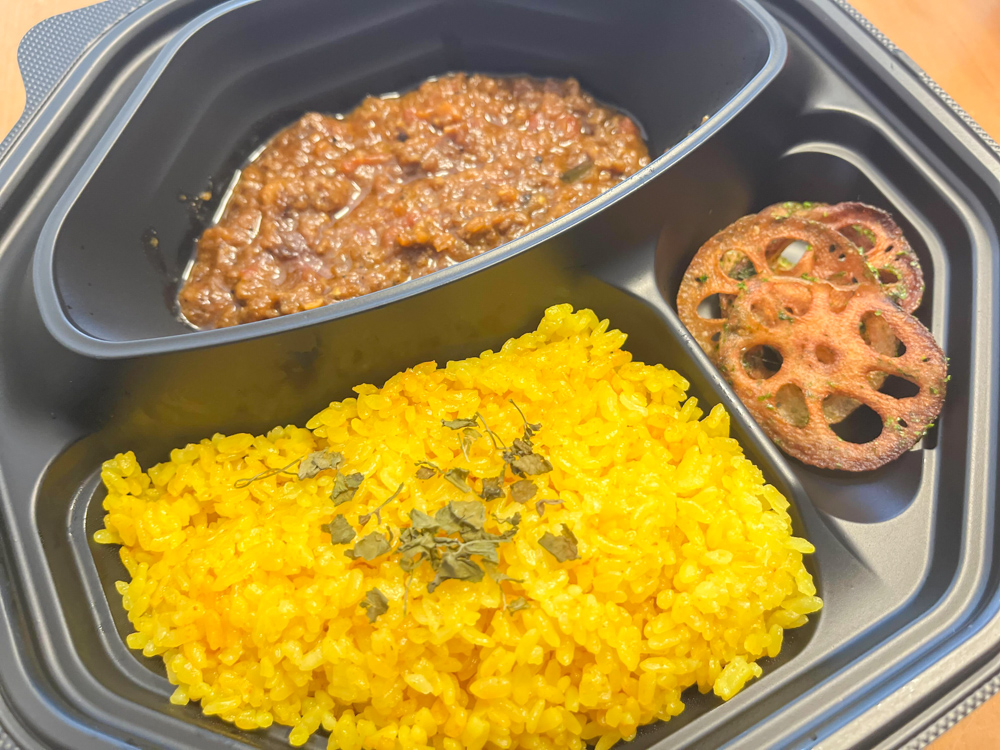 この日は牛ホルモン和出汁カレーがある日だったので、それと茄子のキーマカレーの2種にしてもらいました。