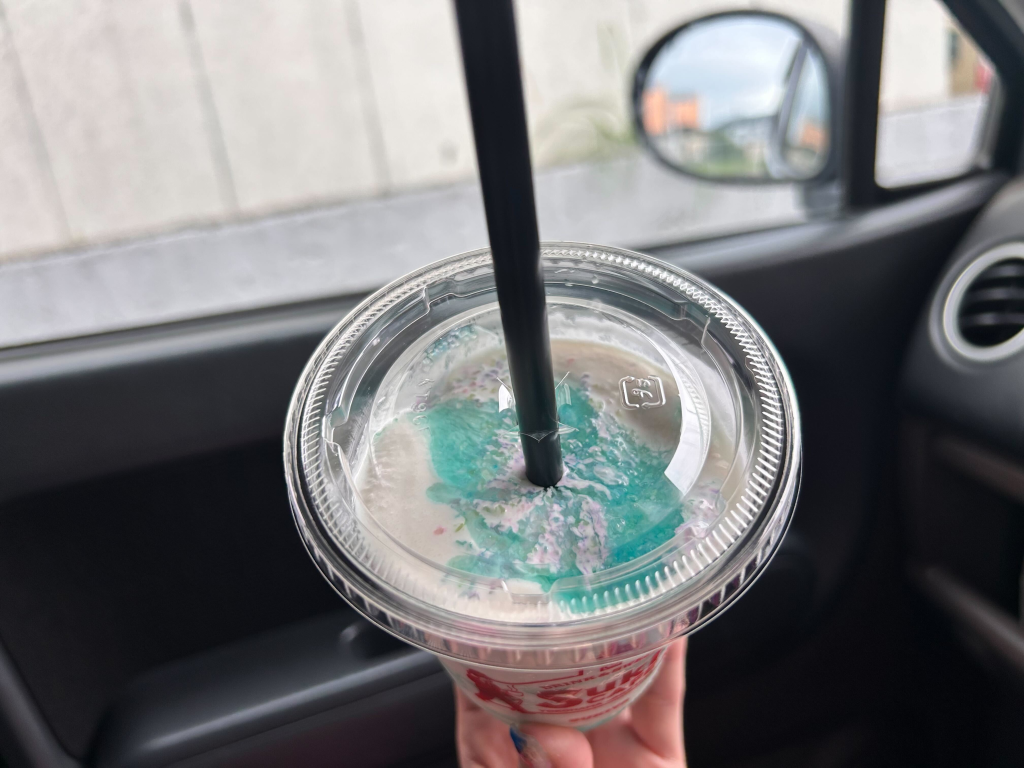 見えにくいんですけど、上に紫とか黄色とか水色とかの砂糖がかかっているんです。それがシェイクにまざってシャリシャリの食感になって美味しいのと、娘がキラキラで可愛い〜!って喜んでました。笑