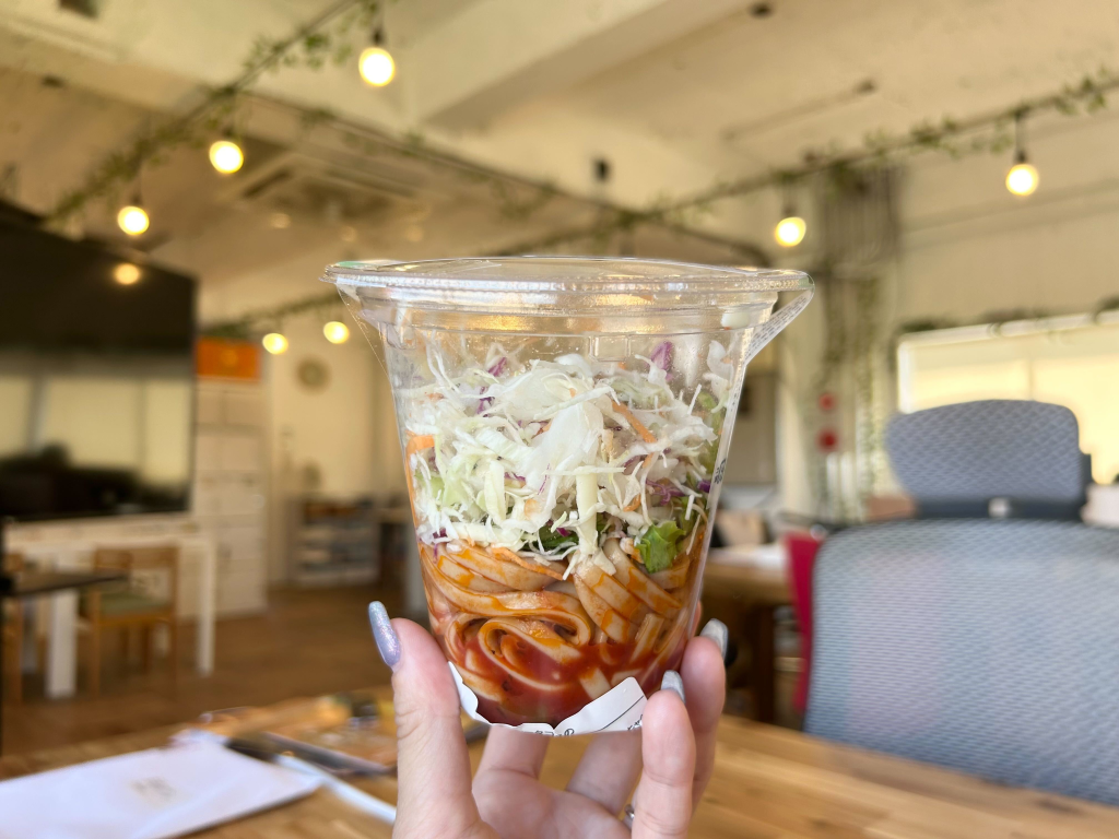 こんな感じでサラダとパスタが半々くらい。トマトベースでひき肉っぽいトッピングと混ざってミートパスタ感もありますが、名前の通りちゃんとスパイシーでちゃんとタコス!