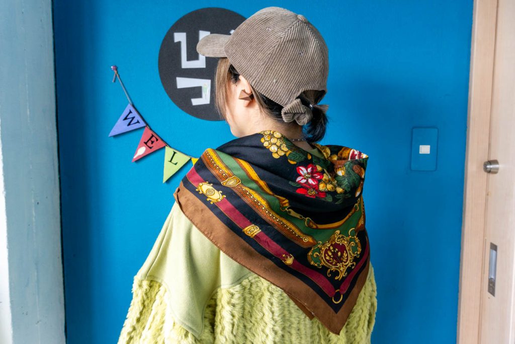 古着屋さんって、なんか見てるだけでワクワクしますよね〜。いろいろ気になるアイテムはあったんですが、この大判スカーフに一目惚れ!