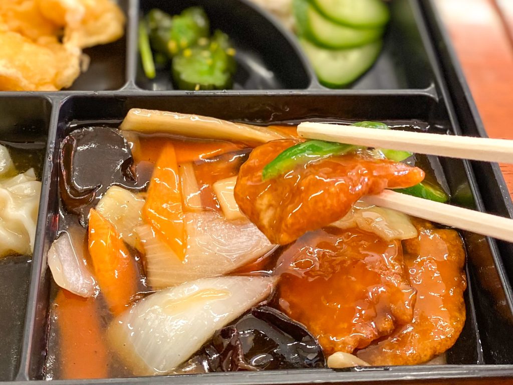 赤龍丼と平らな豚肉の酢豚は
