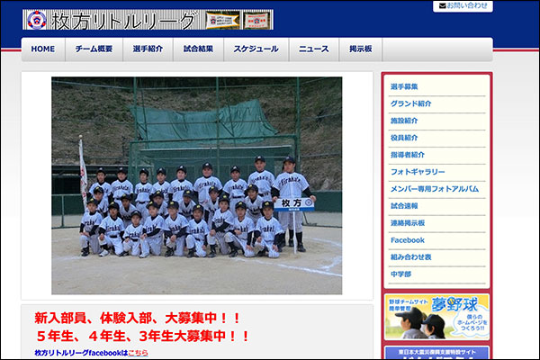 主な戦績:2015年 関電ベースボール大会 優勝(V3) 第38回朝日新聞社旗争奪大会 準優勝 / 2022年 枚方連盟杯争奪大会学童の部 優勝 / 2022年 枚方連盟杯争奪大会ジュニアの部 準優勝