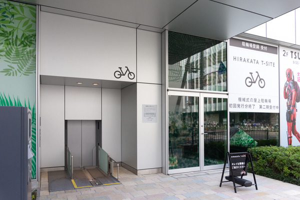 T−SITEの屋上にも駐輪場があり、サンプラザホテル側に回ると自転車を出し入れできる駐輪場ゲートが現れます。ただしこちらは利用に登録が必要なので、詳しくは「枚方T-SITEに世界初の屋上駐輪場ができるみたい」の記事をご覧ください〜!