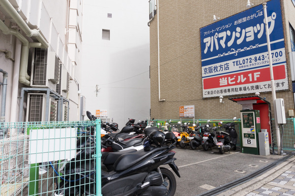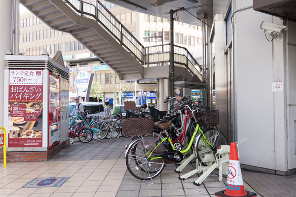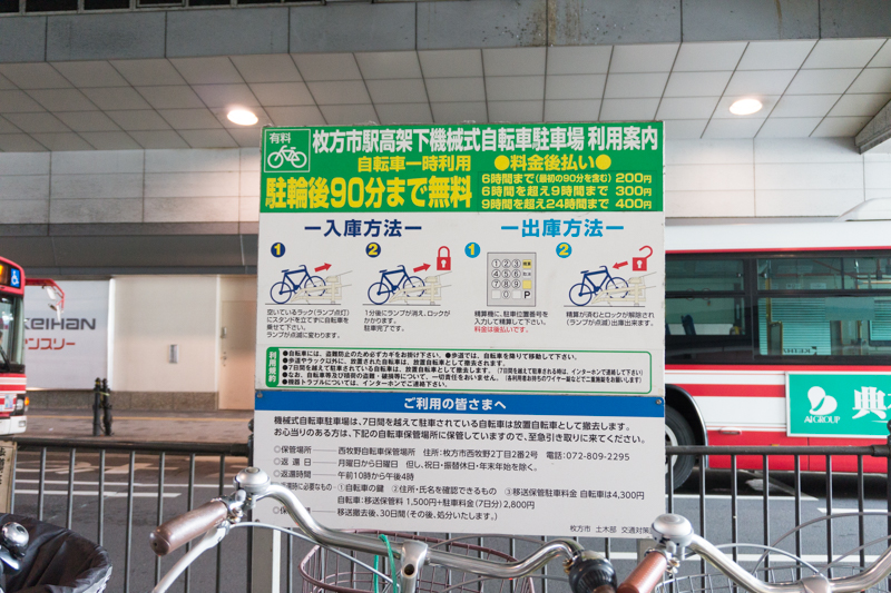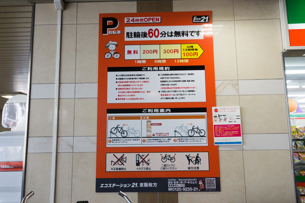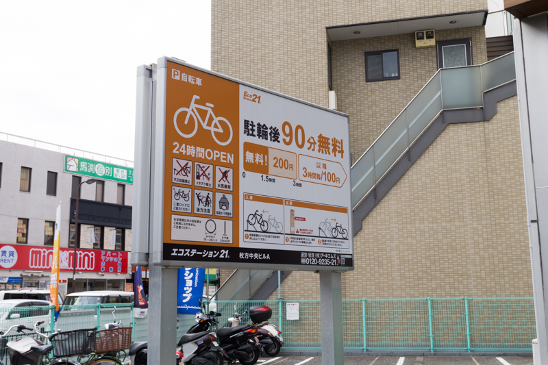 こちらも自転車のみ。道路を挟んで向かいと違うのは60分ではなく90分無料であることです。枚方市駅東口に続く階段が近くにあります。