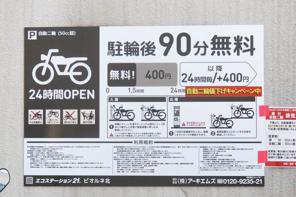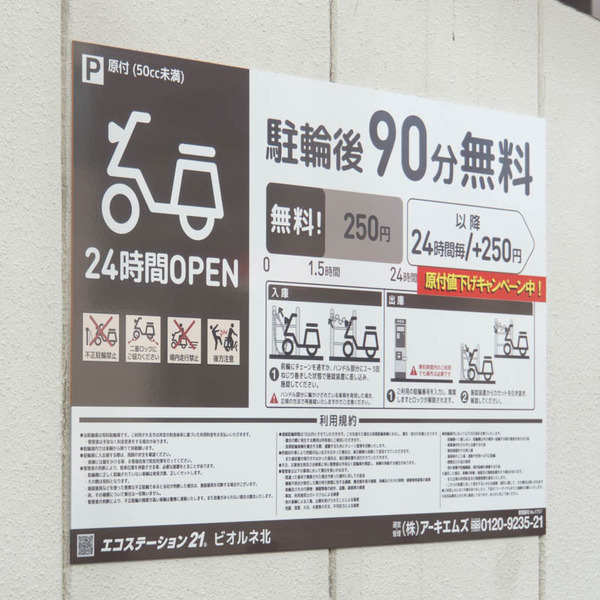 | 24 | NEW!!ビオルネ北駐輪場 | 1.5 | 無 | 原付 250/24h 二輪 400/24h |