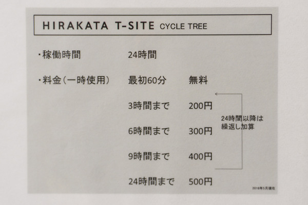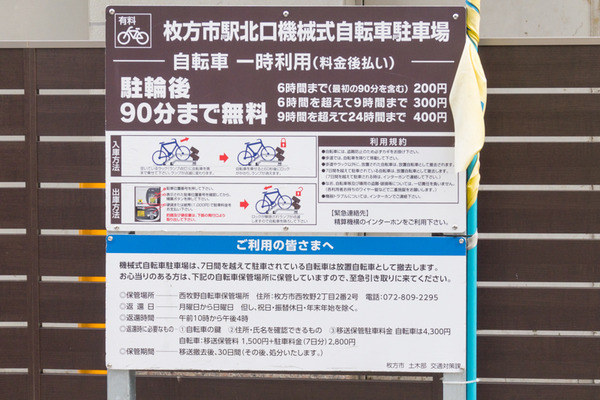 | 3 | 枚方市駅北口機械式駐輪場 | 1.5 | 200/6H | 無 | 24時間営業 |