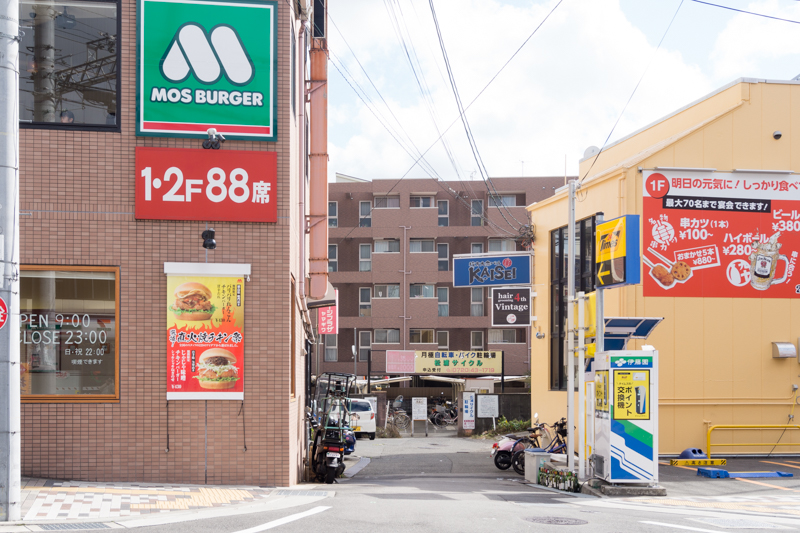 モスバーガーの向かいにあり、隣には京阪ステーションモールの駐車場などが。