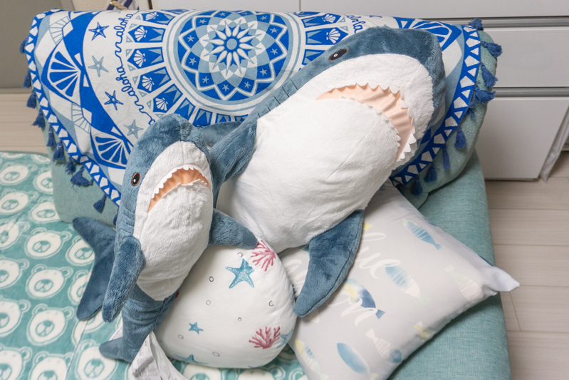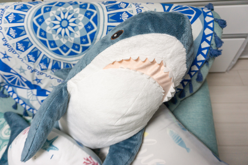 下のほうでべろんべろんしているタグは、正直邪魔なのですが切ってしまうと「IKEAのサメという証明ができなくなる」そうなのでそのままです。血統書…!