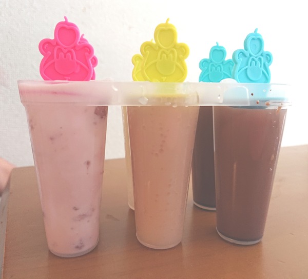 家にあるジュースなどを入れて冷凍庫で凍らすだけアイスキャンディのでっきあっがり〜♪