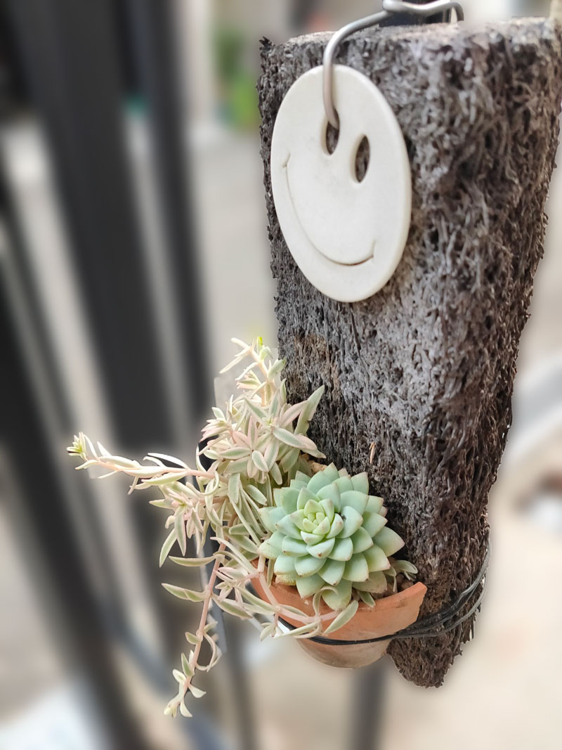 何年か前に緑化フェスティバルで買った吊り下げの多肉ポット。この中身がこの夏枯れてしまい、京阪園芸ガーデナーズに持っていって植え替えしてもらいました。