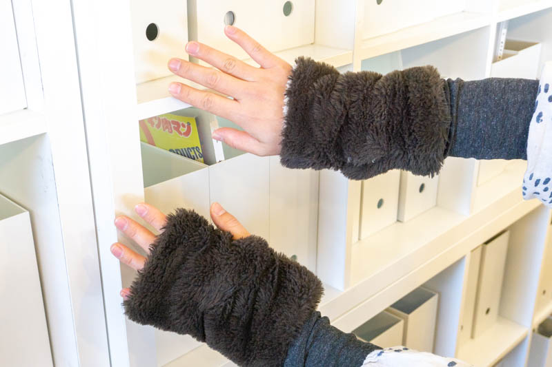 ファーが筒状になっていて、親指を出す穴があるようなデザインなので、このように簡単に手首までズボっておろすことも可能。