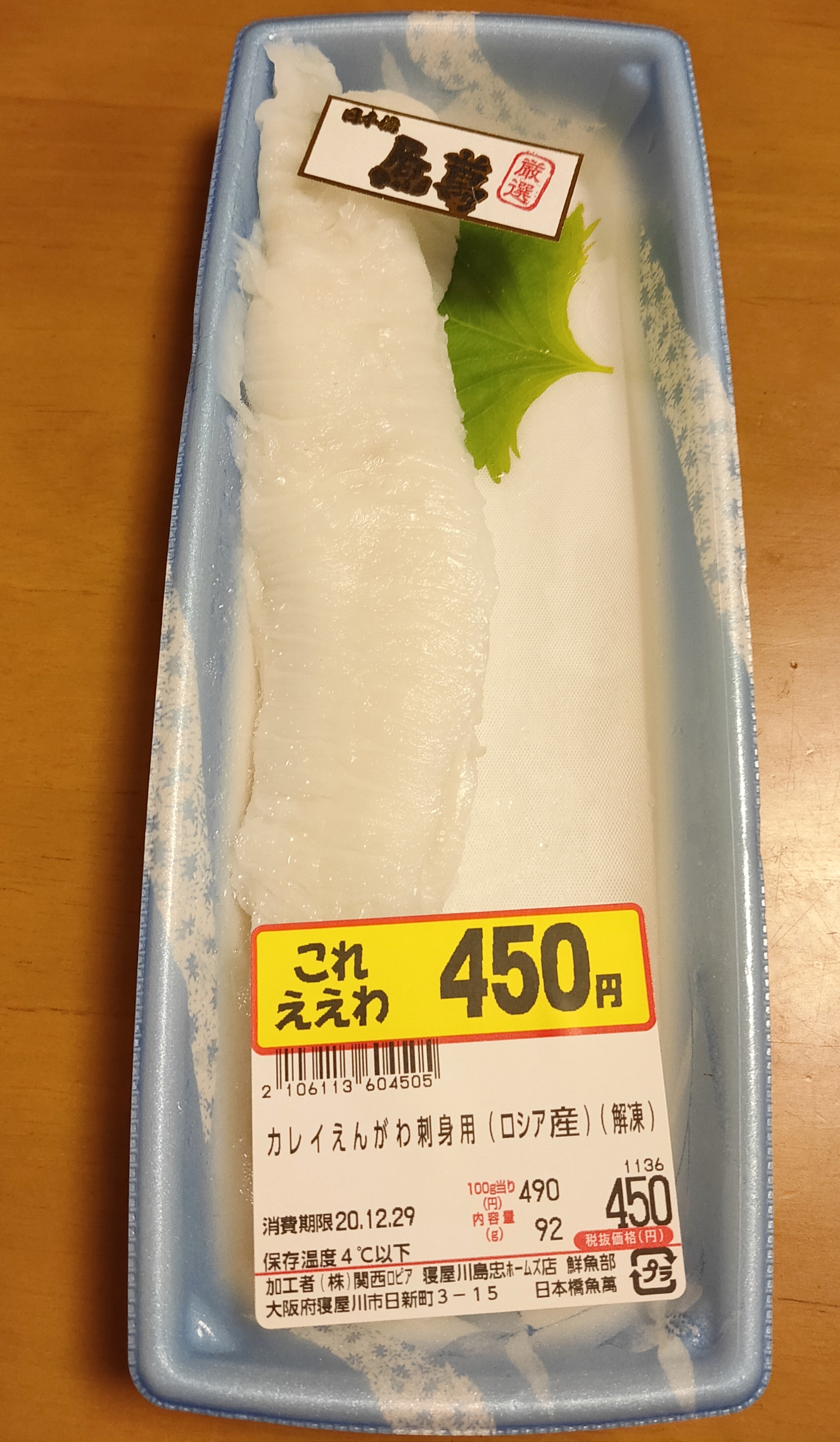 ロピア 寝屋川島忠ホームズ店で買った「カレイえんがわ刺身用」