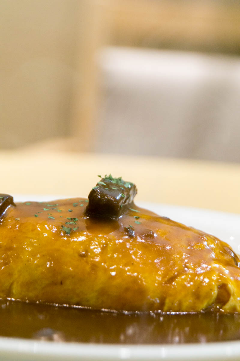 ハヤシライスの甘味と酸味のバランスが絶妙ですごい優しい味で、それとトロふわ絶妙なタマゴ加減。優しいハヤシライスと包み込まれるようなタマゴ。頭の中にユーミンが思い浮かびます。