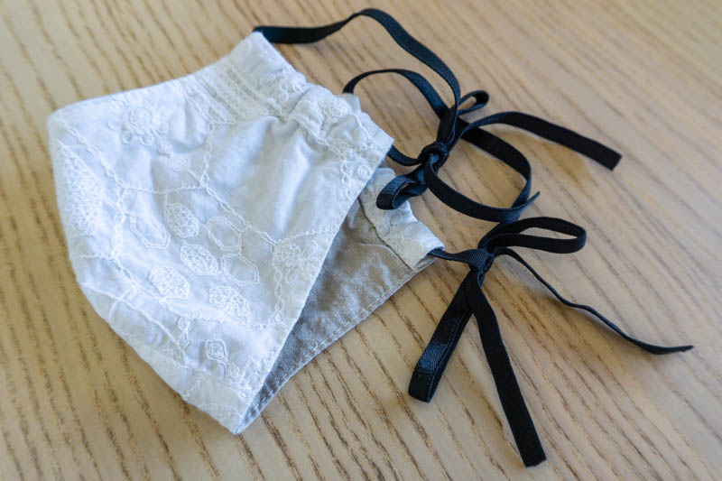 耳に引っ掛ける部分は黒いリボンゴムになっていて、自分で長さを調節してリボン結びするタイプ。