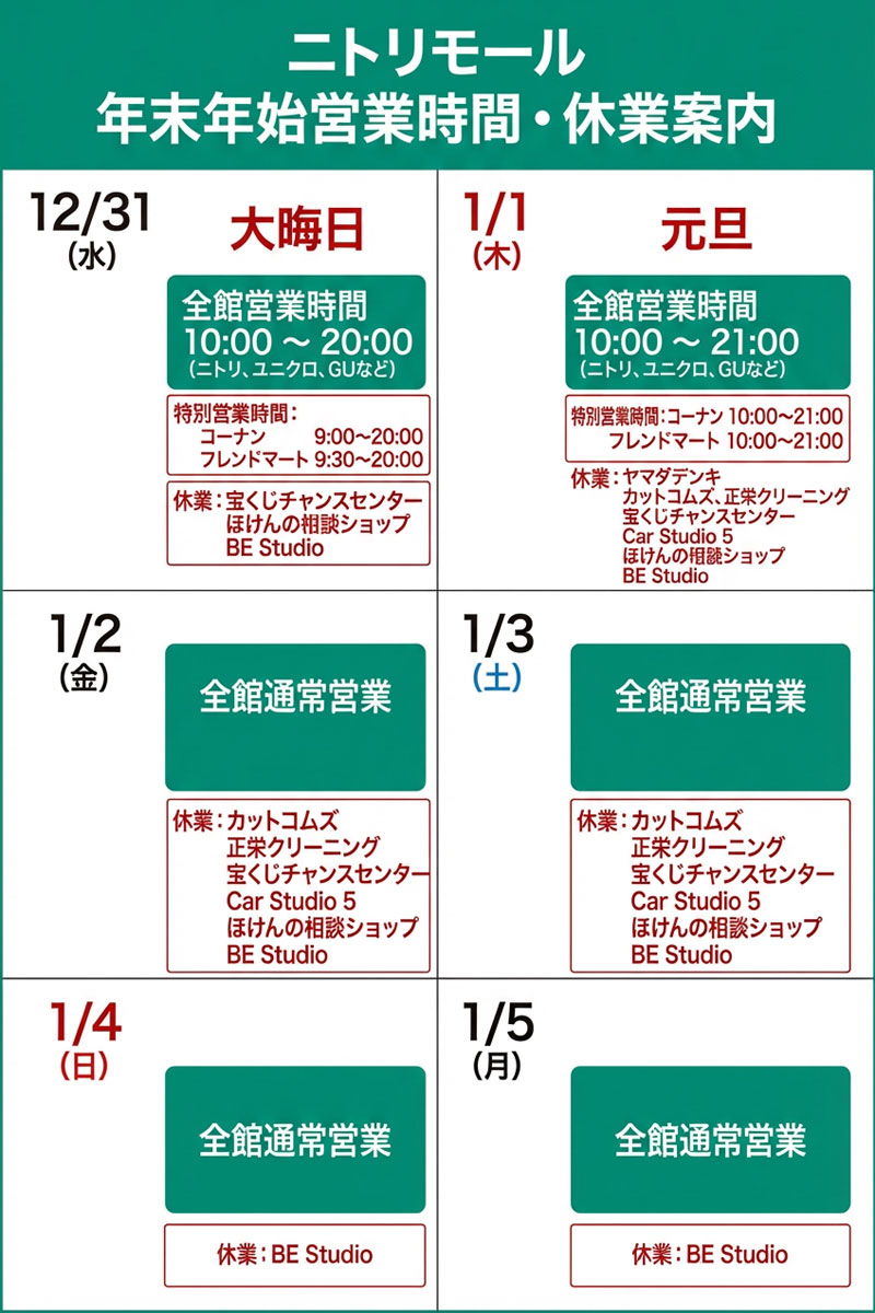 2025年末~2026年始の営業時間を記載していますので、お出かけの際はご参考にどうぞ。