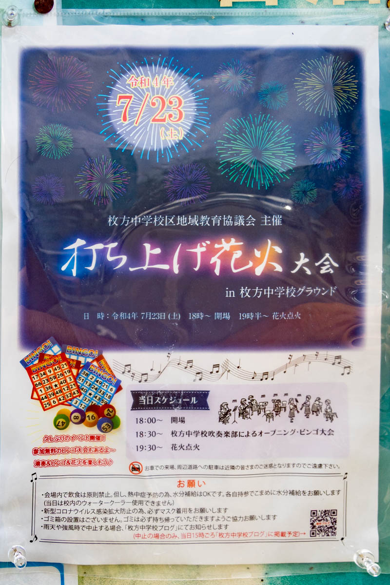 「枚方中学校区地域教育協議会主催 打ち上げ花火大会 in枚方中学校グラウンド」18:00開場19:30花火点火
