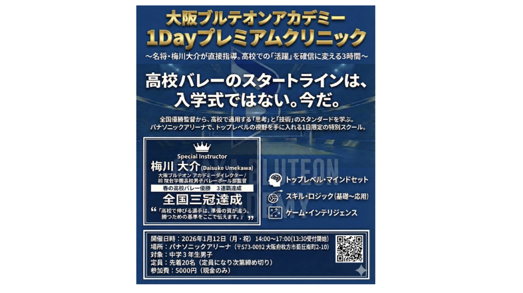 大阪ブルテオンアカデミーの公式発表によると、1月12日に「1Dayプレミアムクリニック」がパナソニック アリーナで実施される予定となっています。