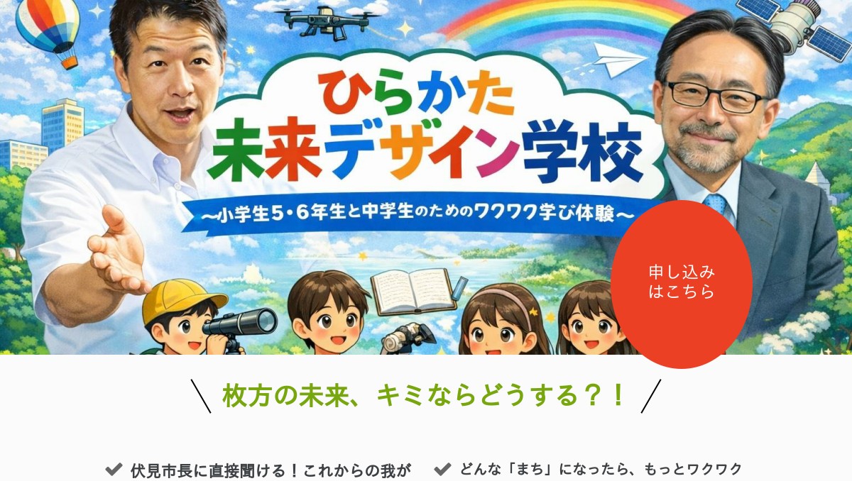 公式サイトによると、ひらかた未来デザイン学校はワークショップを通じて、こどもたちが未来をデザインする学びの場だそう。伏見市長も参加して、自分たちの将来や地域のことを考える体験型のイベントです。