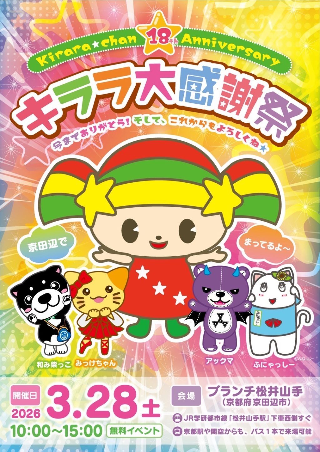 誕生18周年を迎える京田辺観光大使のキララちゃんをはじめ、北海道からアックマ、千葉県船橋市からふなっしーファミリーのふにゃっしー、枚方のPR大使みっけちゃん、京都市の和み柴っこも参加という豪華メンバーです!