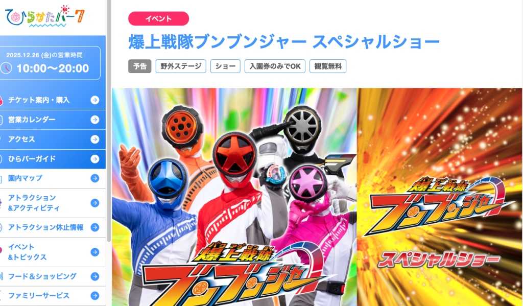 ひらパーのイベントページによると、2026年1月25日(日)に「爆上戦隊ブンブンジャー スペシャルショー」が開催されるとのことです。