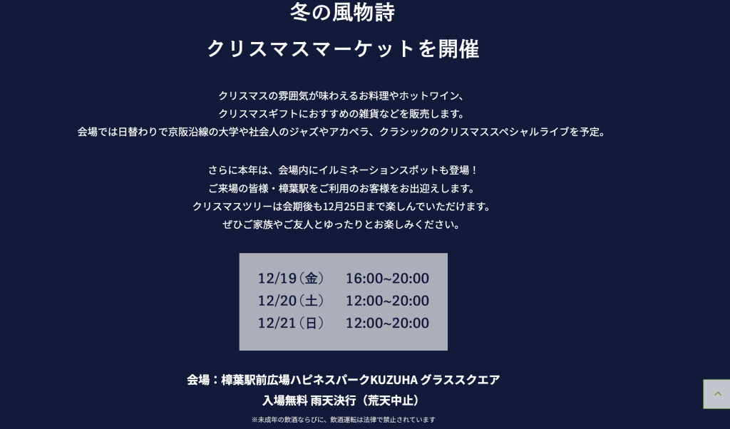 会場は「樟葉駅前広場ハピネスパークKUZUHA グラススクエア」で、期間中は料理やホットドリンク、クリスマスギフト向け雑貨などが並ぶ予定とのこと。