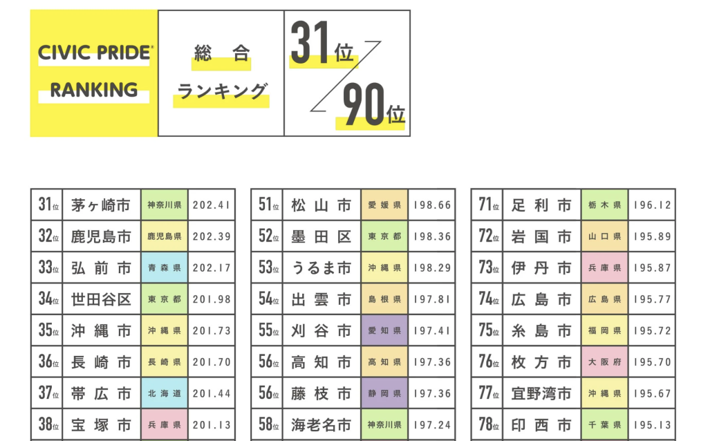 この調査は、住民が「愛着」や「誇り」を感じる街をランキングにしたもので、今回が初の全国調査とのこと。