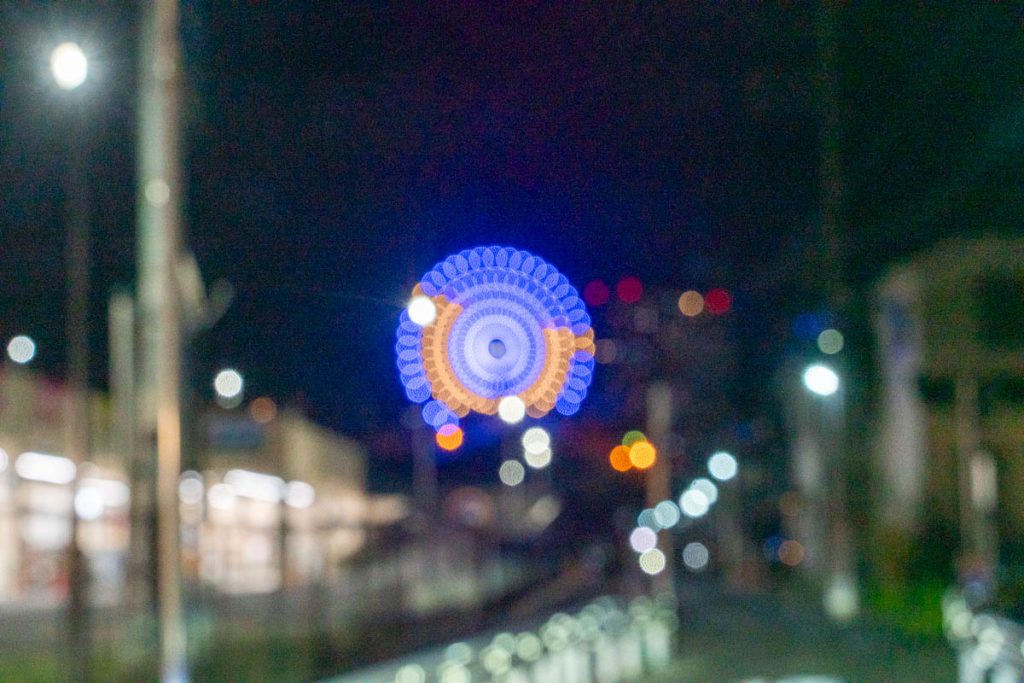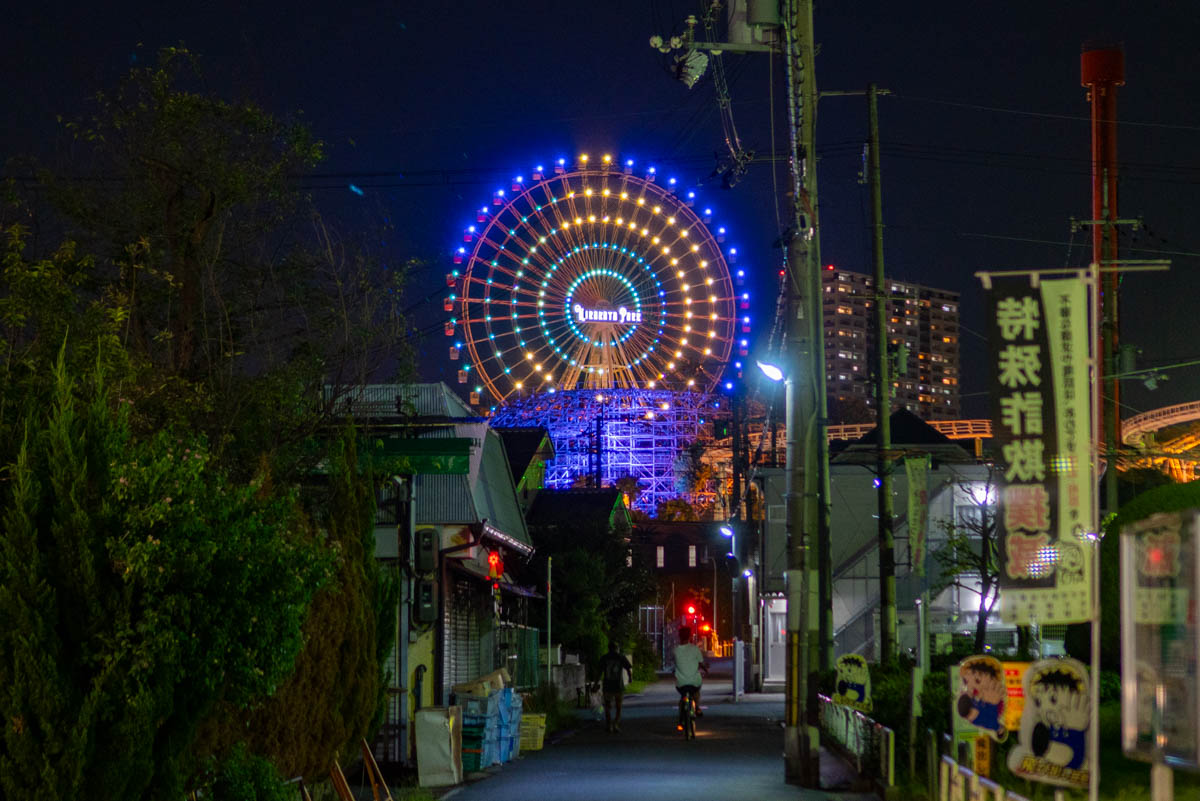 電車からも見える観覧車の「ひ」の文字。ちょっと仕事帰りにひらパー側をご覧になってみては!