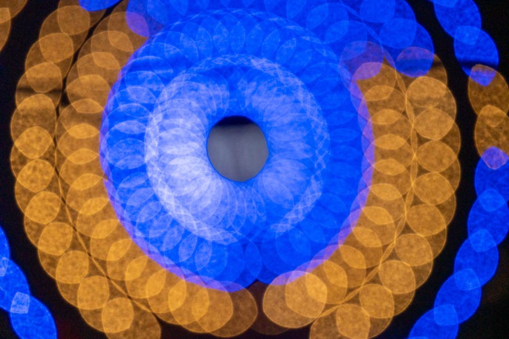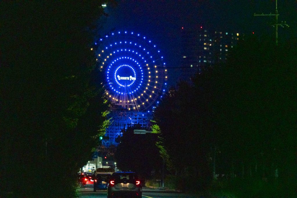 ひらかたパークの観覧車「スカイウォーカー」が完全に深い青色になっています。