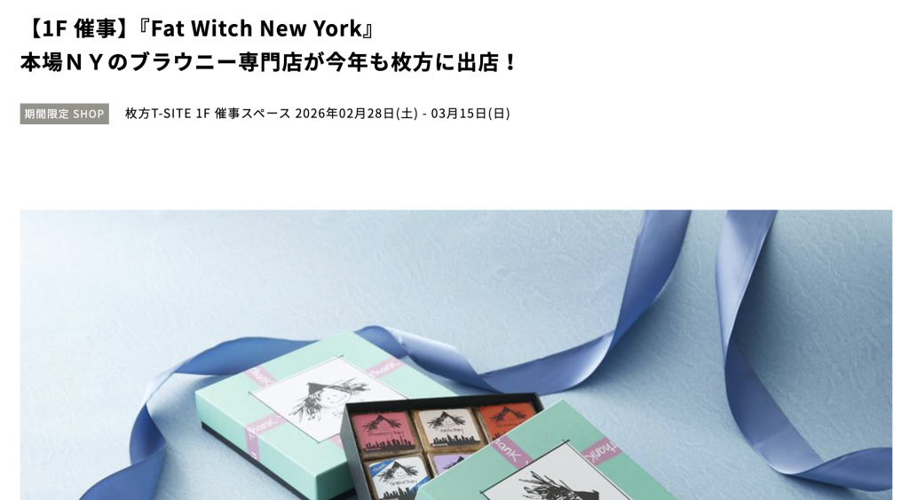 枚方T-SITEの公式サイトによると、本場NYのブラウニー専門店「Fat Witch New York」が今年も出店するとのこと。