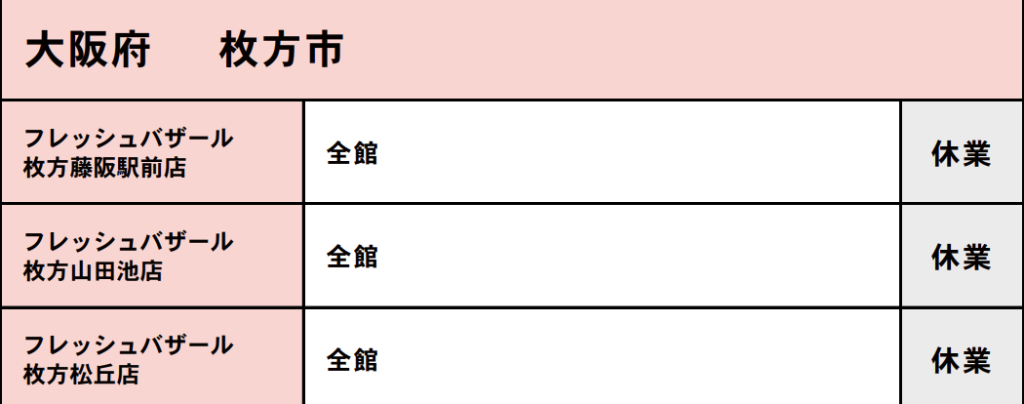枚方市内のフレッシュバザールが全店臨時休業するようです。
