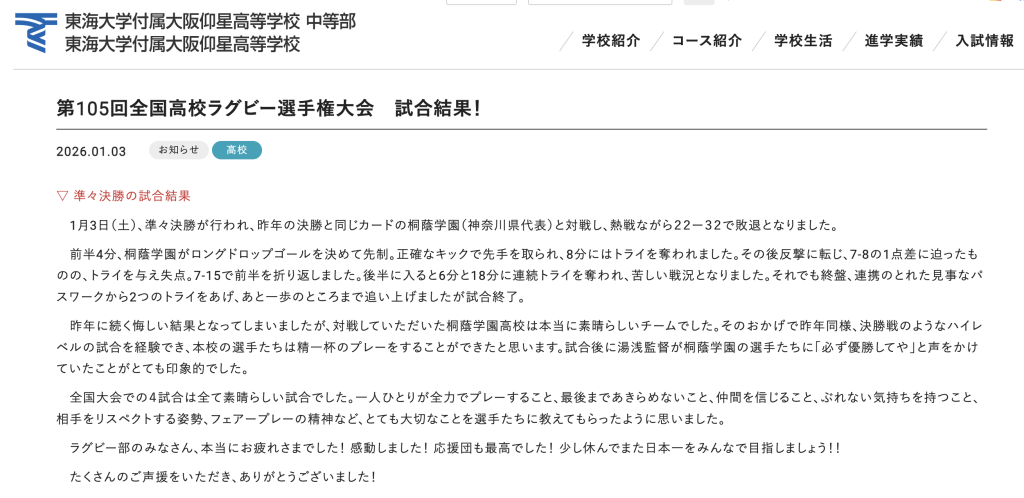 東海大学付属大阪仰星高校が「第105回 全国高等学校ラグビーフットボール大会」で8強入りを果たしたようです。