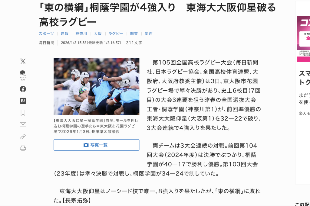 毎日新聞の公式サイトを見てみると1月3日、東大阪市花園ラグビー場で「第105回 全国高等学校ラグビーフットボール大会」の準々決勝が行われたとのこと。