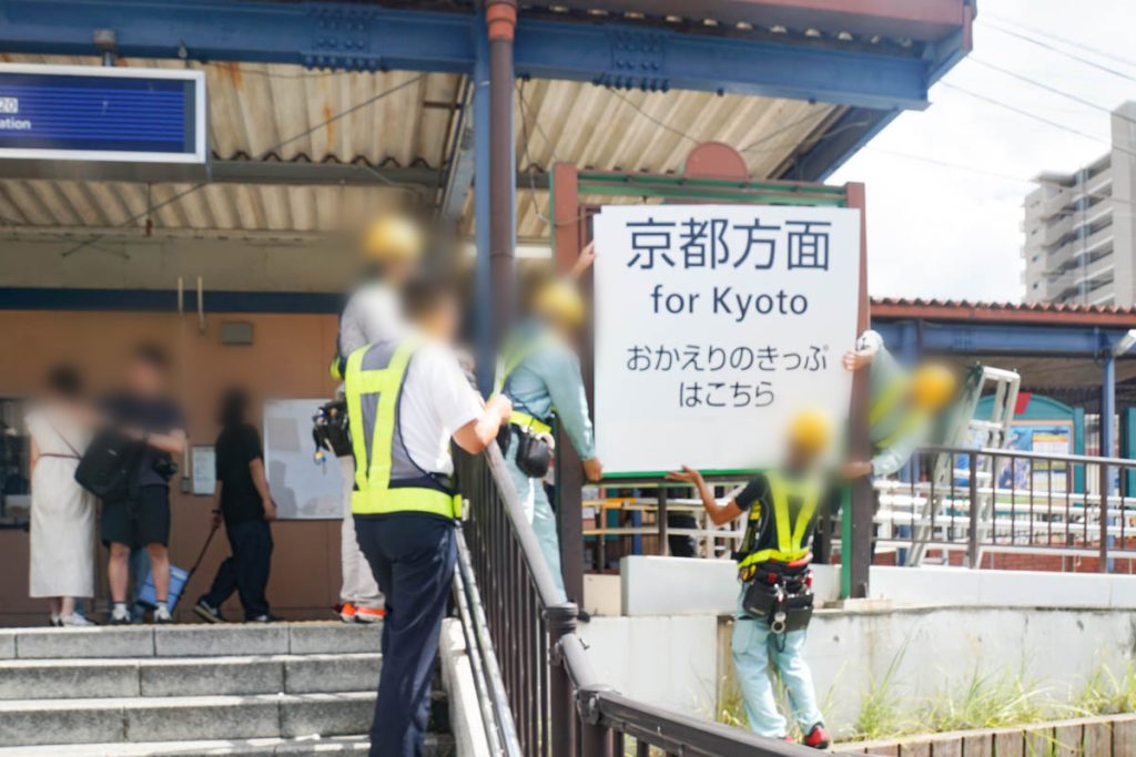 駅では京阪電車の人が「京都方面」の看板を設置している最中でした。帰りはめちゃくちゃ混み合いそうですし、いまのうちに帰りの切符を買っておくのが無難かもですね〜!