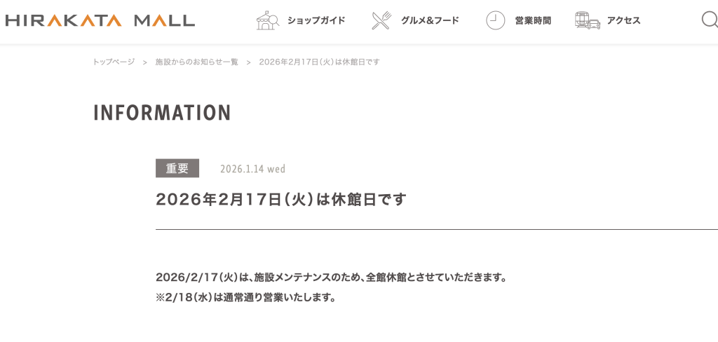 枚方モールの公式サイトによると、2月17日は施設メンテナンスのため、全館休館する模様。