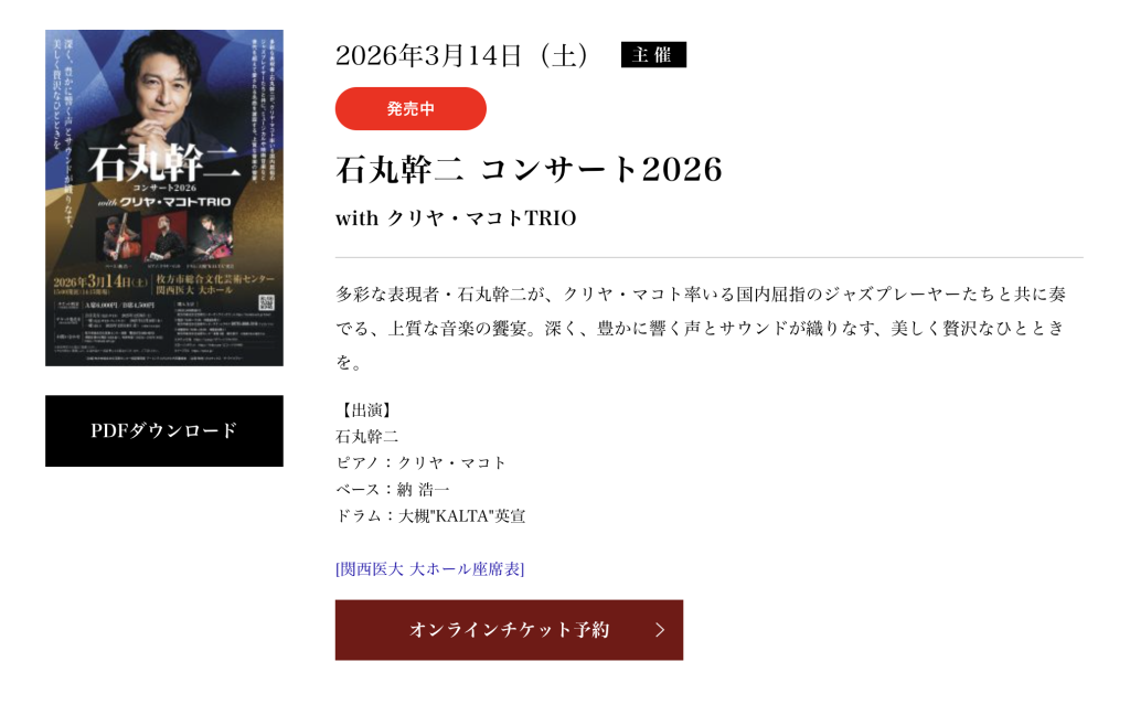 枚方市総合文化芸術センターで「石丸幹二 コンサート2026」が開催されるようです。