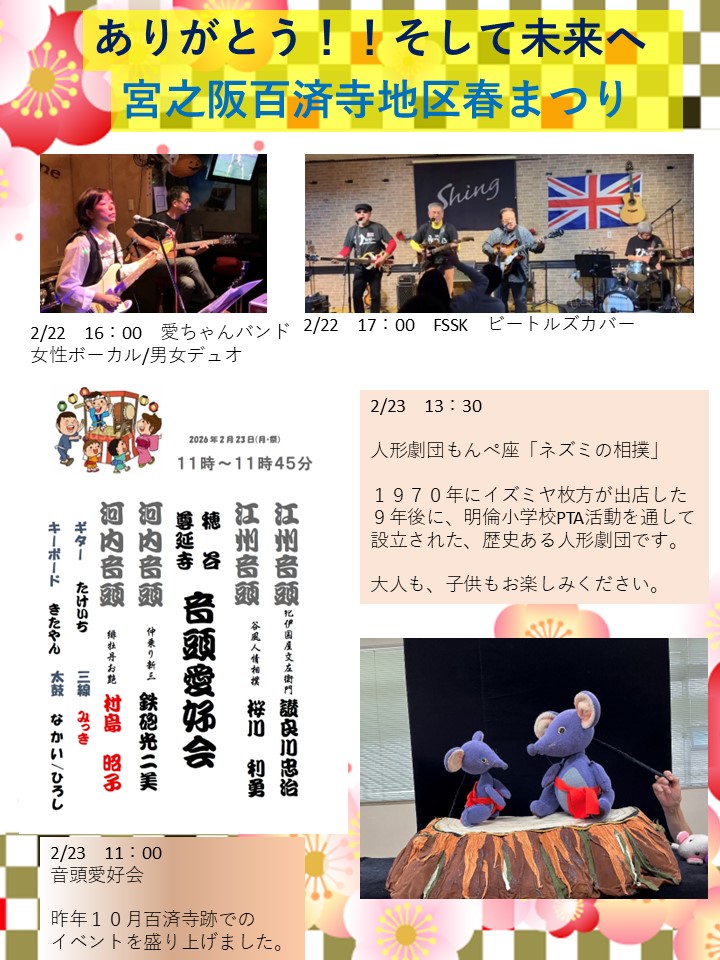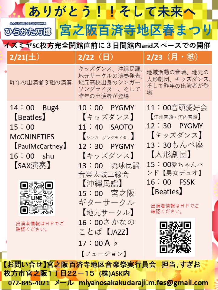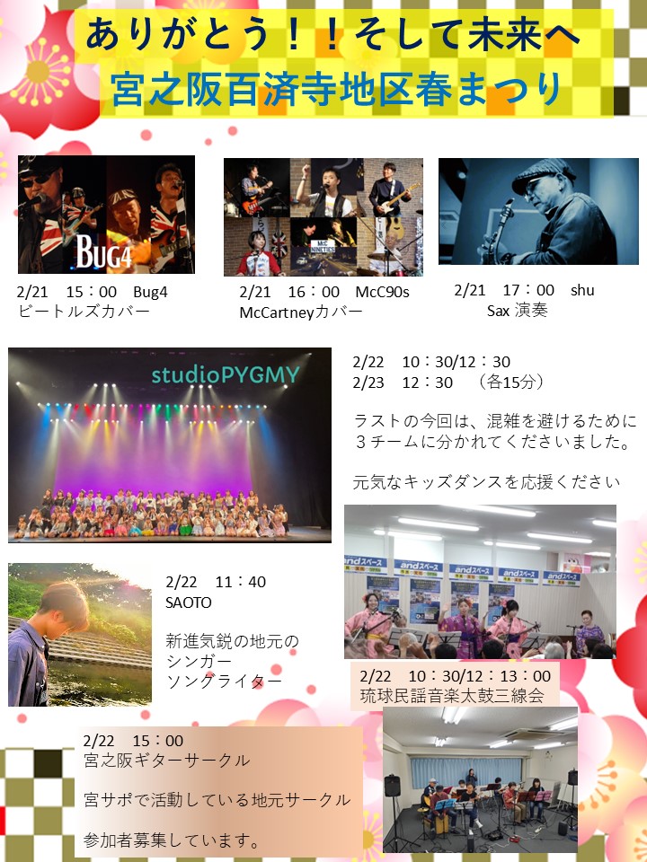 2月21日(土)~23(月)の3日間、キッズダンス、jazz、ビートルズ、江州音頭、人形劇など多彩なジャンルのライブを開催します。