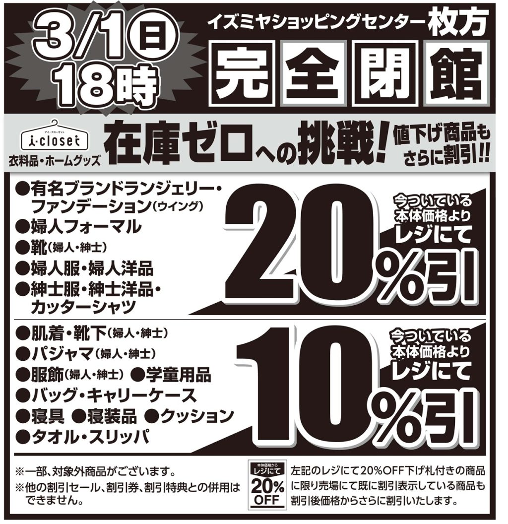 2階I-CLOSET(衣料品売場)では、特別割引セールとして、全品レジにて20%~10%(一部商品除く)セールを開催中!