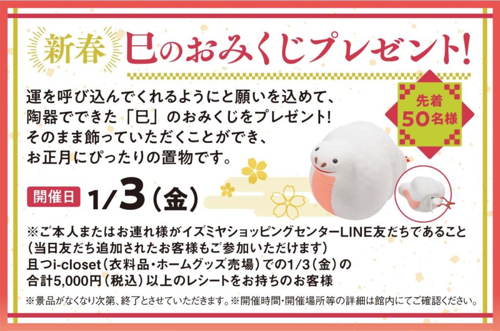 イズミヤショッピングセンターのLINE友だちで、1月3日にi-closet(衣料品・靴・ホームグッズ売場)での税込5,000円以上購入のレシートを持っている方におみくじのプレゼントが!