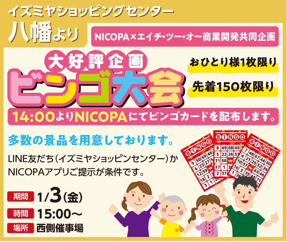 衣料品などもお得に買えますし、ビンゴやスクラッチで運試しもいいですね!年明けのお買い物はぜひイズミヤショッピングセンター八幡へ〜!