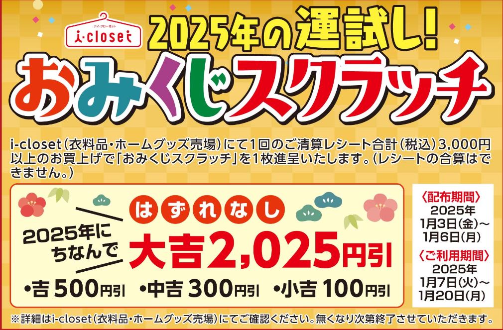 また、1月3日〜6日の期間中、i-closet(衣料品・靴・ホームグッズ売場)で税込3,000円以上購入すると、「おみくじスクラッチ」が1枚進呈されるのだとか。大吉当てたい!
