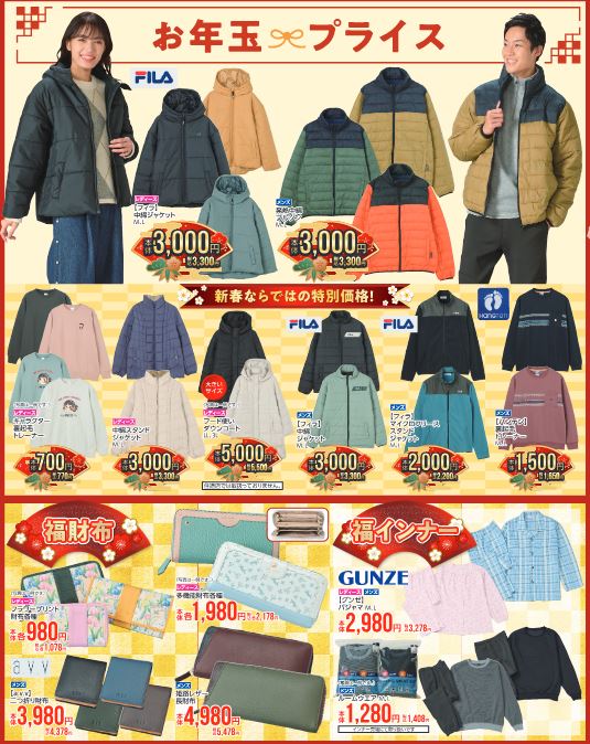 衣料品やお財布もお年玉プライスでお得に買えちゃいます。