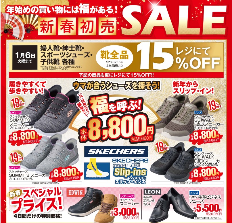 靴全品今ついている値段よりレジにて15%OFF。うまのように軽やかなシューズを!人気のSKECHERSもさらにレジにて15%OFF。1月6日(火)までなので、お見逃しなく!