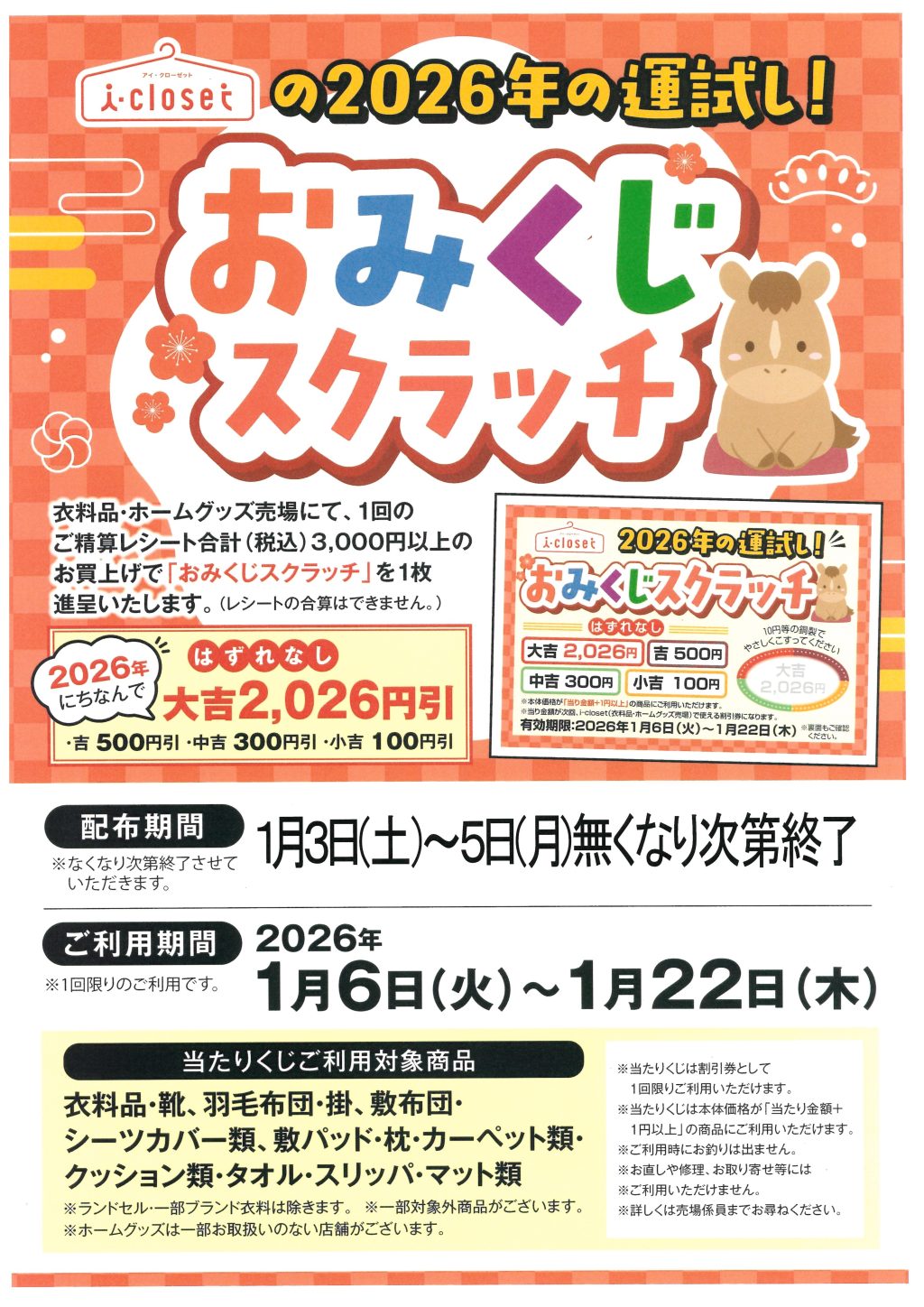 衣料品・ホームグッズ売り場にて、1回のご精算レシート合計3,000円(税込)以上で「おみくじスクラッチ」を1枚進呈いたします。
